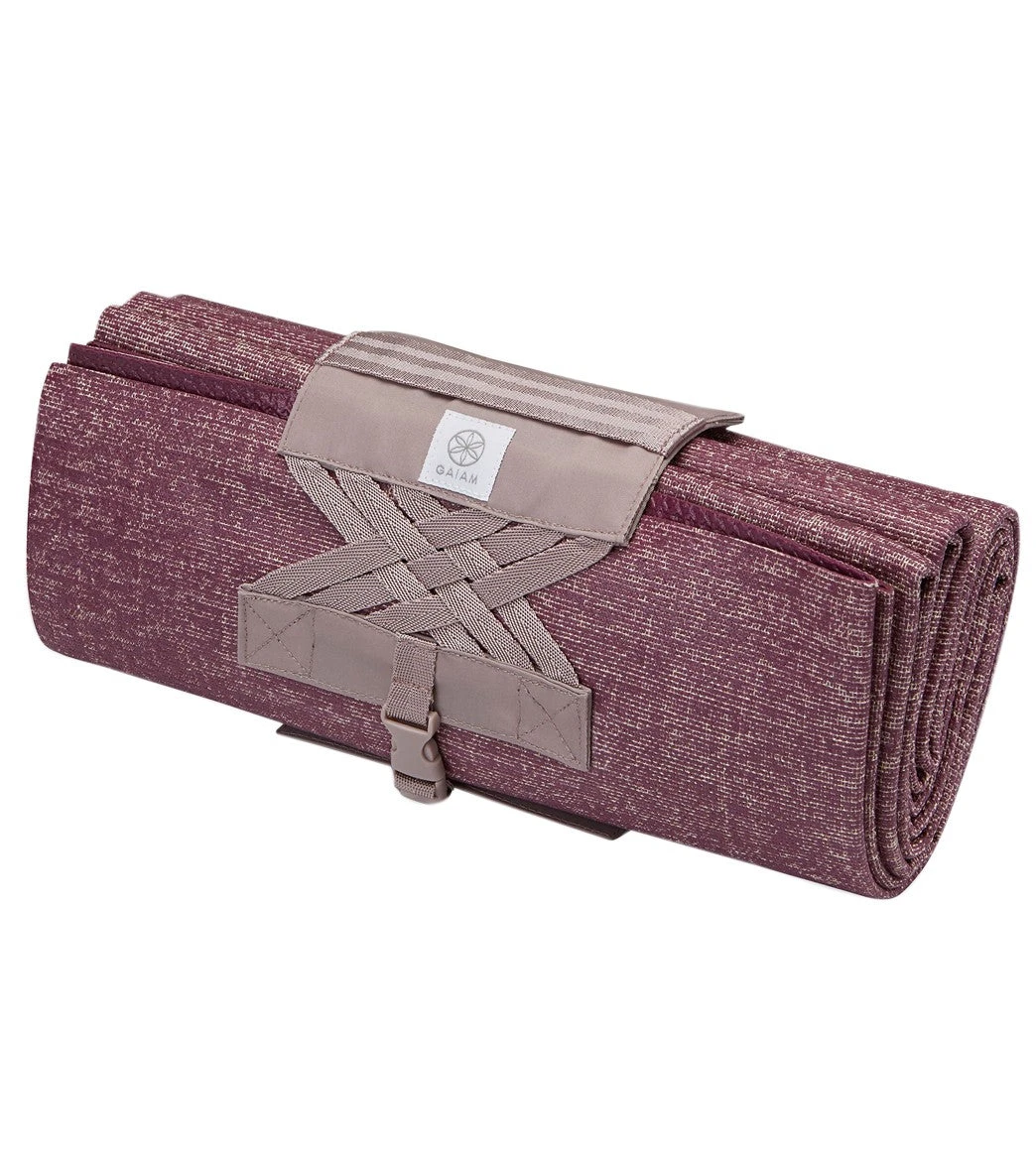 The Gaiam On-The-Go Pro Yoga Mat 68″ 2mm is ideal for travel, folding up for easy storage and snap-in-place straps for convenience. While only 2mm thick, it still features a sticky texture on each side for optimal grip and performance.